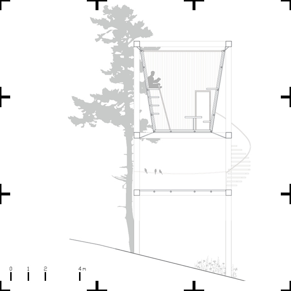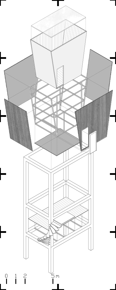 The banks of the Arga River form a small universe inhabited by herons, pines, oaks, beech martens and poplars. Óskar becomes one more among them. The architecture blends into the forest, giving shelter to a person — a new inhabitant of this natural environment. The project consists mainly of three enclosed pavilions placed within three superstructures, connected by pathways through the woods, walkways suspended in the air, and platforms among the branches. The pavilions frame the forest, the sky, the river, and nature itself; as well as the shadows, the submerged island, waiting, and memory. The interior looks outward. The pavilions are physically hermetic spaces, protected from the cold and the rain, places of refuge — yet visually open to nature. The furniture and the wooden-panel flooring provide places to sit, lie down, or walk barefoot in contact with the outdoors — a soft and warm refuge in direct relation with nature. A single base structure supports the interior CLT panels, the exterior wooden cladding, and the glass that encloses each pavilion. From the outside, the pavilions appear held within the superstructure. The system is the same in all the pavilions, but rotated depending on what each one frames and where it is oriented. It is modular, based on 2.1 m and 0.82 m, so that, in addition to supporting the cladding, it also serves as the framework for the doors. The wooden slats that cover the interior of the pavilions are of the same dimensions in each one; only the openings for the doors change.