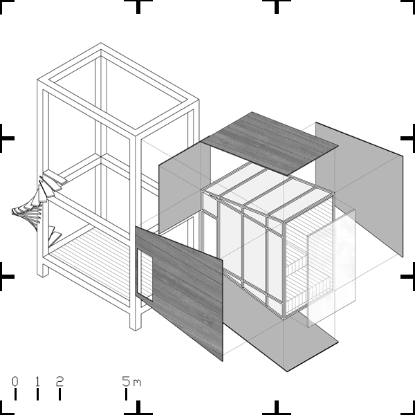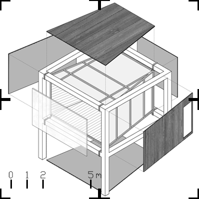 Es igual en todos los pabellones, pero rotada según qué enmarca y hacia dónde mira. Se modula en base a 2,1m y 0,82m para servir, además de soporte para los revestimientos, de bastidor de las puertas. Las láminas de madera que cubren el interior de los pabellones son de las mismas dimen-siones en cada uno, sólo cambian las aberturas para las puertas.