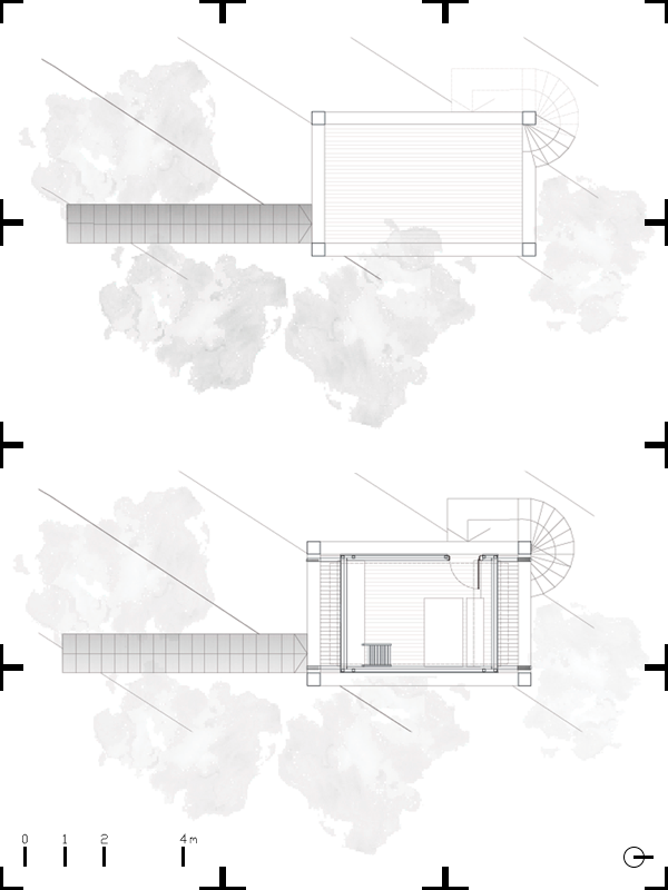 La orilla del rÃo Arga es un pequeño universo habitado por garzas, pinos, robles, garduñas y álamos. A ellos se suma Óskar. La arquitectura se integra en el bosque, y da hogar a una persona, un nuevo habitante de esta naturaleza. El proyecto consta, principalmente, de tres pabellones cerrados dentro de tres superestructuras, conectados por recorridos en el bosque, accesos sobre el aire y pla-taformas entre las ramas. Los pabellones enmarcan el bosque, el cielo, el rÃo, la naturaleza; y las sombras, la isla su-mergida, la espera y el recuerdo. El interior mira al exterior. Los pabellones son espacios fÃsicamente herméticos, aislados del frÃo y la lluvia, lugares de refugio; pero visualmente abiertos a la naturaleza. Los muebles y el suelo de paneles de madera son lugares donde sentarse, tumbarse o ca-minar descalzo en contacto con el exterior, un refugio suave y cálido en contacto con la na-turaleza. Una misma estructura base sirve de soporte para los paneles de CLT en el interior, el reves-timiento de madera exterior y el vidrio que cierra cada pabellón. Los pabellones se perciben desde el exterior contenidos en la superestructura. Es igual en todos los pabellones, pero rotada según qué enmarca y hacia dónde mira. Se modula en base a 2,1m y 0,82m para servir, además de soporte para los revestimientos, de bastidor de las puertas. Las láminas de madera que cubren el interior de los pabellones son de las mismas dimen-siones en cada uno, sólo cambian las aberturas para las puertas.